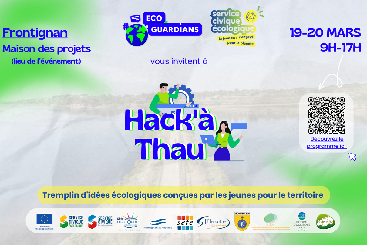 participant·e·s de travailler ensemble afin de faire émerger des idées et des solutions innovantes. Notre Hack’à Thau a pour objectif de donner l'opportunité à des jeunes du territoire de mieux comprendre les enjeux et menaces écologiques sur le Bassin de Thau, et de devenir acteur de la transition écologique en imaginant des solutions portées par des jeunes. Ce projet est organisé par le CPIE Littoral d'Occitanie, avec la participation de Coopere 34, l'ARDAM, et le SDJES 34, et le soutien de l'Agence Nationale du Service civique et de l'Union Européenne.